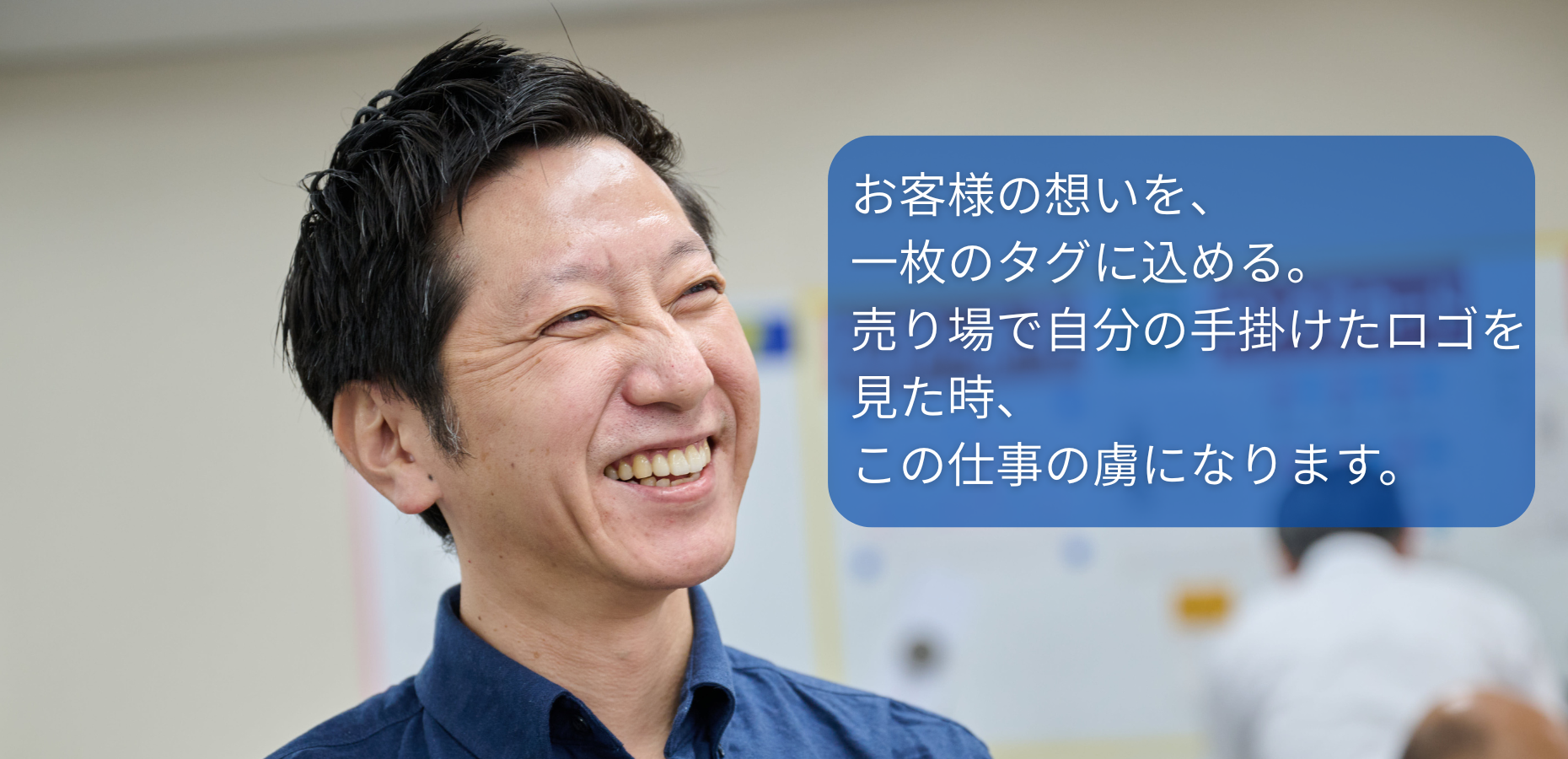 現在は本社で生産課長として、タグやネームなど、お客様から発注いただいた商品のデータ入力やレイアウト準備を中心に担当しています。オペレーターがスムーズに作業できるようにデータを整え、効率的に生産できる体制を整えるのが主な役割です。実質的には生産管理に近い仕事内容で、作業の流れが滞らないよう、現場全体を支えるポジションを担っています。