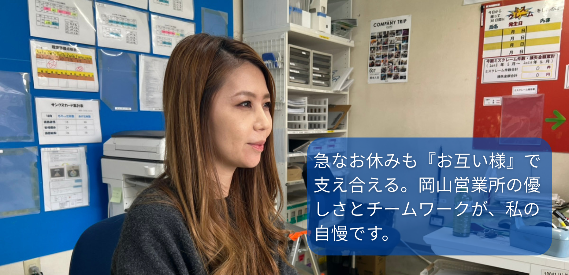 営業サポートとして、営業がよりスムーズに動けるよう、正確さ・スピード・段取り力をさらに高めていきたいと考えています。岡山営業所にはまだ伸びしろがあると感じており、より効率よく業務が回るよう支えることで、営業所全体の力を引き出せる存在になりたいと思っています。また、働きやすさと人間関係の良さは大きな魅力であり、これからも長くこの職場で貢献していきたいと考えています。